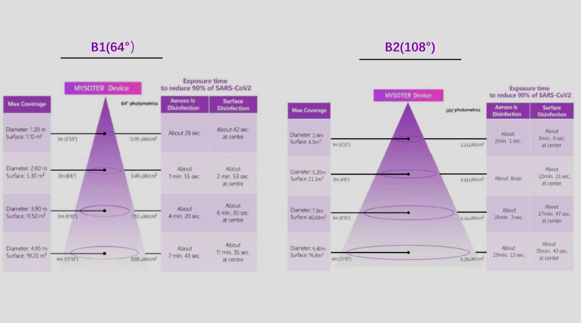 Beam Size is based on the width of the beam. For the B1 the beam is smaller and more compact, so it's more precise in disinfection. Whereas the B2 model is wider so it covers more space. The B1 model is best for close contact disinfection. For instance at a dental visit, you'd want closer disinfection such as 3-4 feet away from the intended target. The B2 model best fits larger spaces. For instance a restaurant setting or at an event, so you can disinfect a wider area.