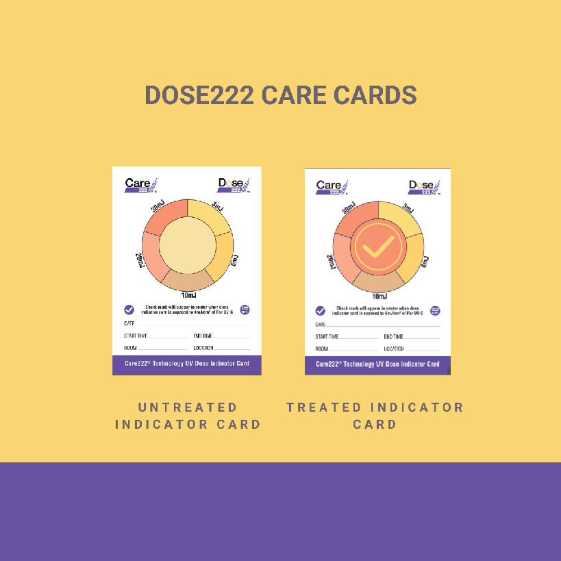 Dose222 should be used on a regular basis, or at least once per week, in areas operating filtered far UV-C devices. Dose222 indicators are designed to provide a visual indication of applied far UV-C dosage within a treatment cycle and are not intended to be used as a substitute for microbiological disinfection verification. Dose222 cards must be stored at room temperature, away from direct sunlight and must not be reused.